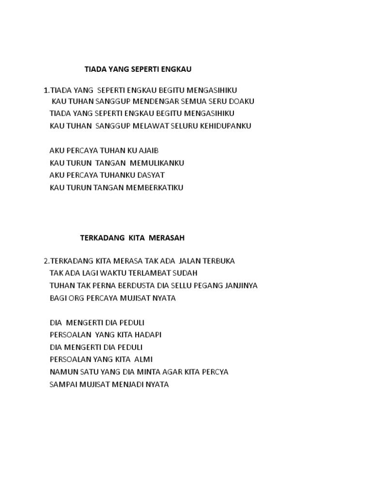 TIADA YANG SEPERTI ENGKAU. Aku Percaya Tuhanku Ajaib Kau Turun Tangan Memulihkanku Aku Percaya Tuhanku Dahsyat Kau Turun Tangan Memberkatiku Kau Turun Tangan. Aku percaya tuhanku ajaib kau turun tangan memulihkanku aku percaya tuhanku dahsyat kau turun tangan memberkatiku kau turun tangan menyembuhkanku.